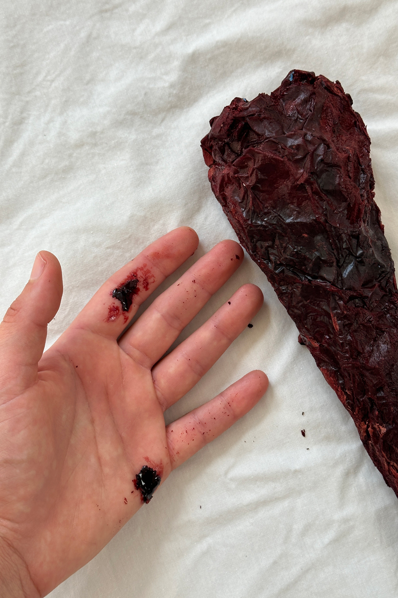 From June 2023-June 2024, I saved my menstrual blood. Inspired by the harsh Midwest winters, I fashioned the liquid into an icicle.