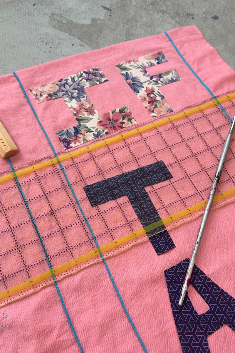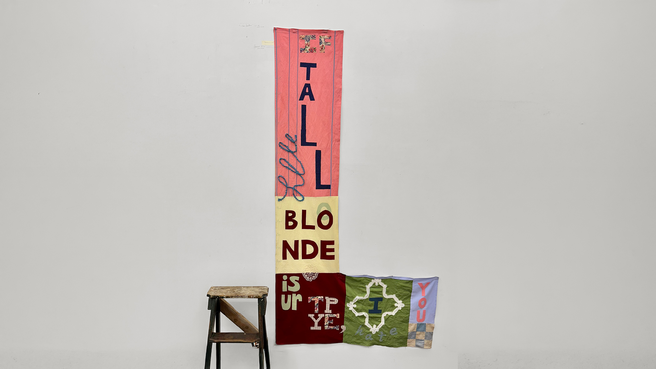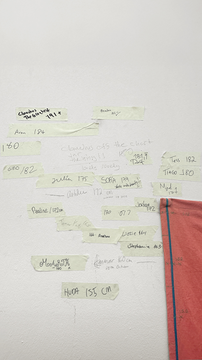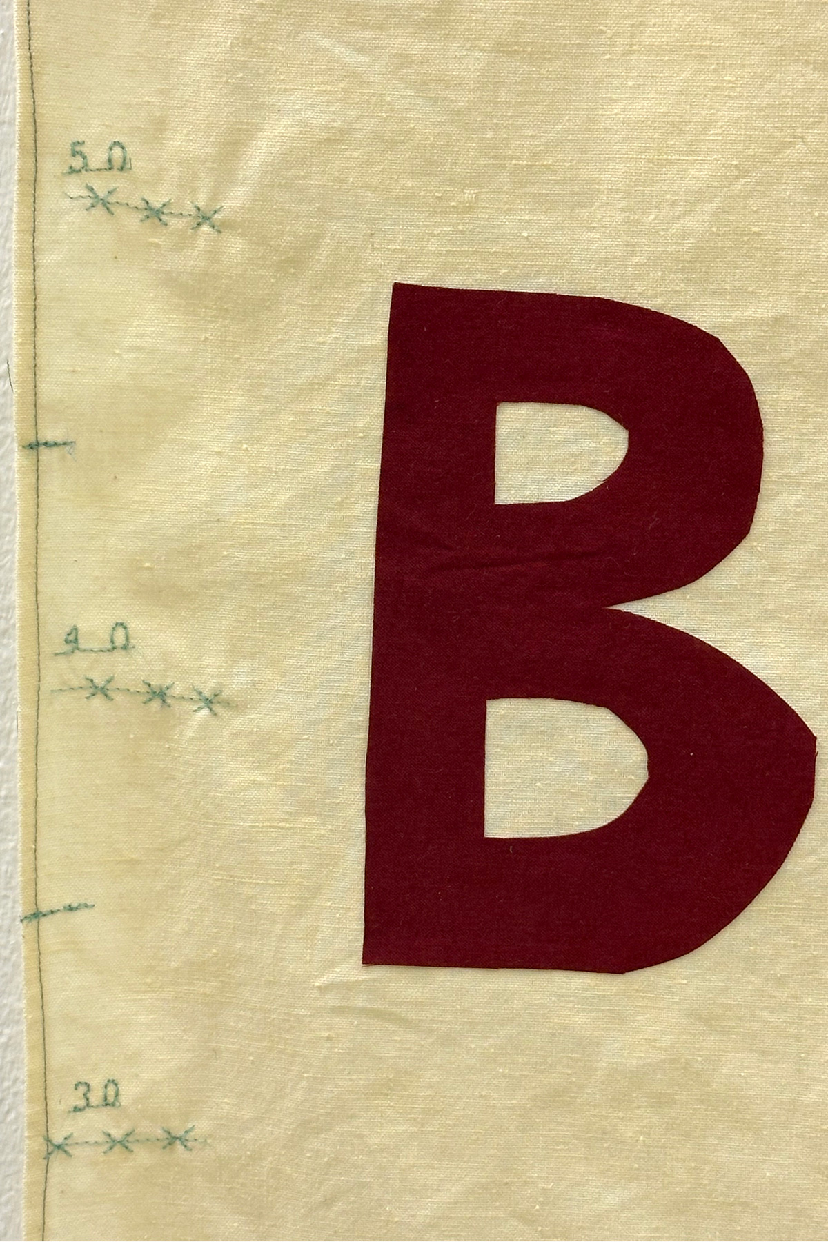 Pieced together using recycled fabrics, this immersive art piece invites viewers to stand on a wooden stool and measure themselves along the stitched measuring tape using centimeters as the metric.