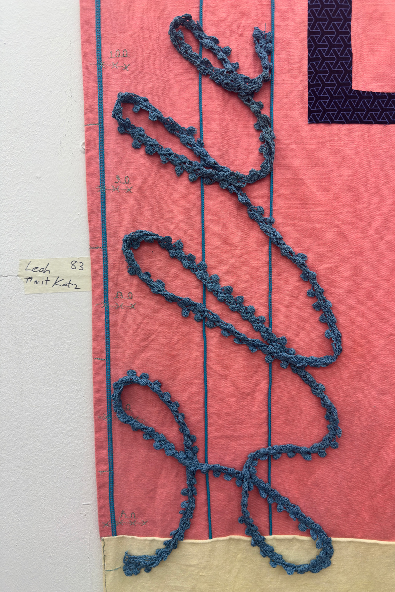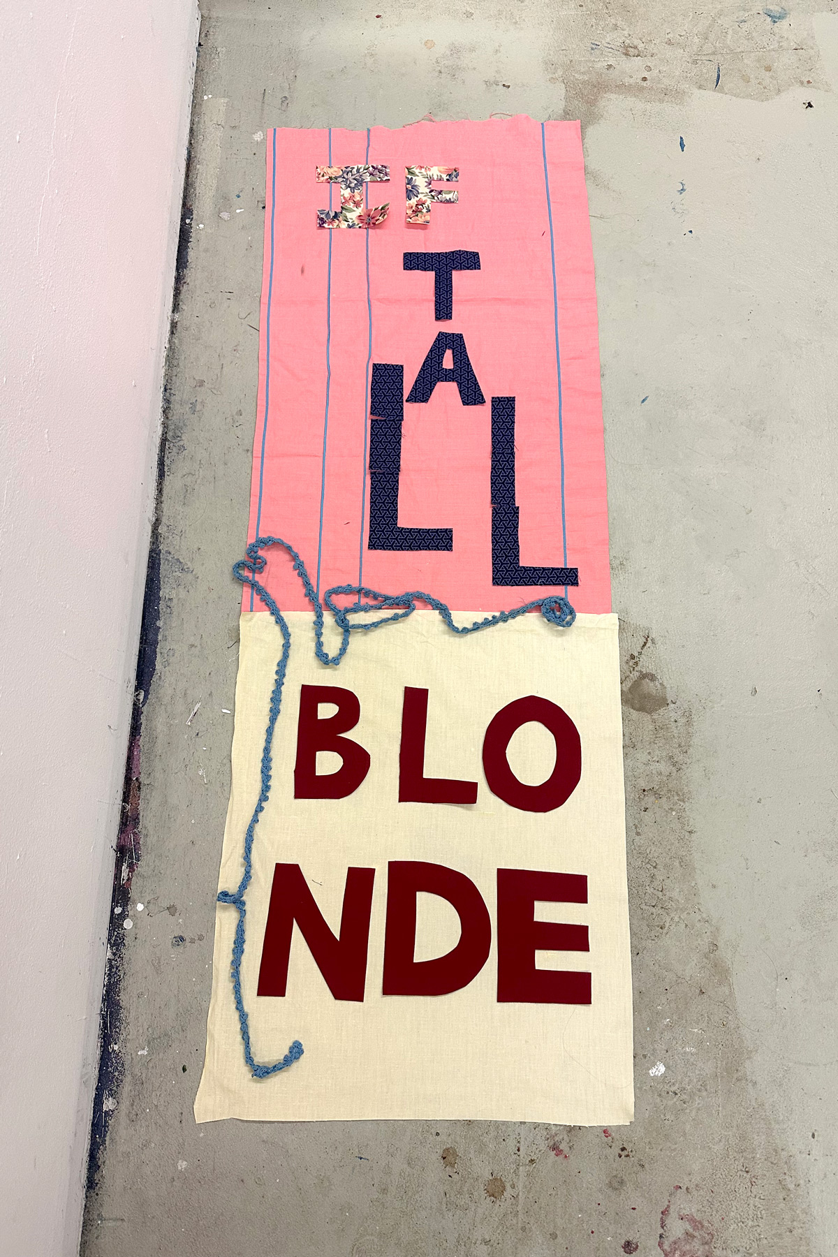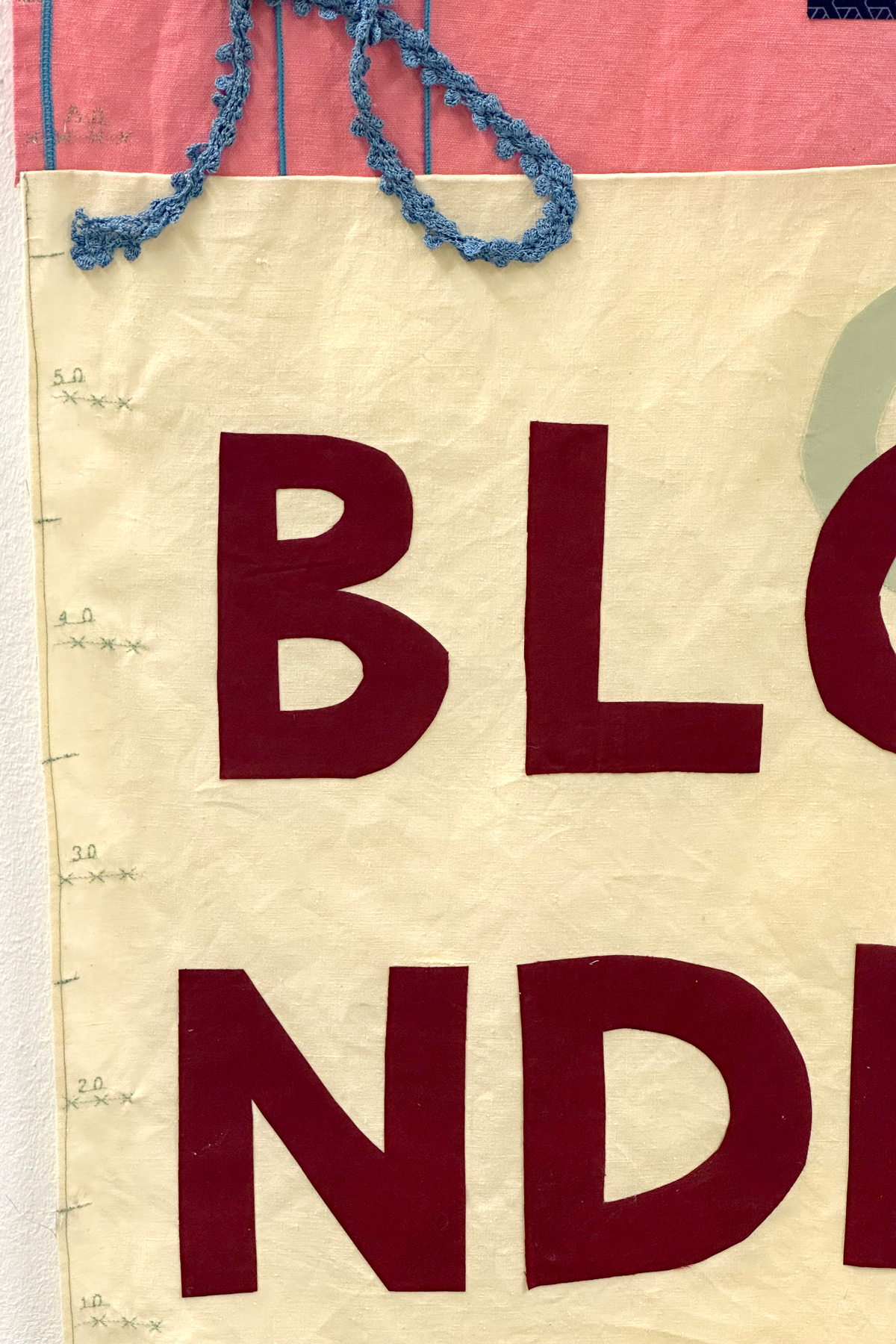 Pieced together using recycled fabrics, this immersive art piece invites viewers to stand on a wooden stool and measure themselves along the stitched measuring tape using centimeters as the metric.