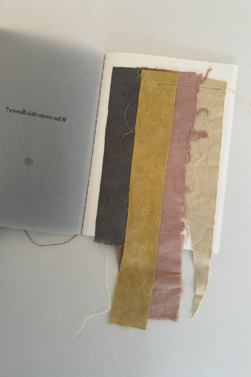 Hand sewn artist book filled with hybrid writing of poetry, memoir, and instructions on how to naturally dye fabrics using plants. Both written and hand bound by the artist.