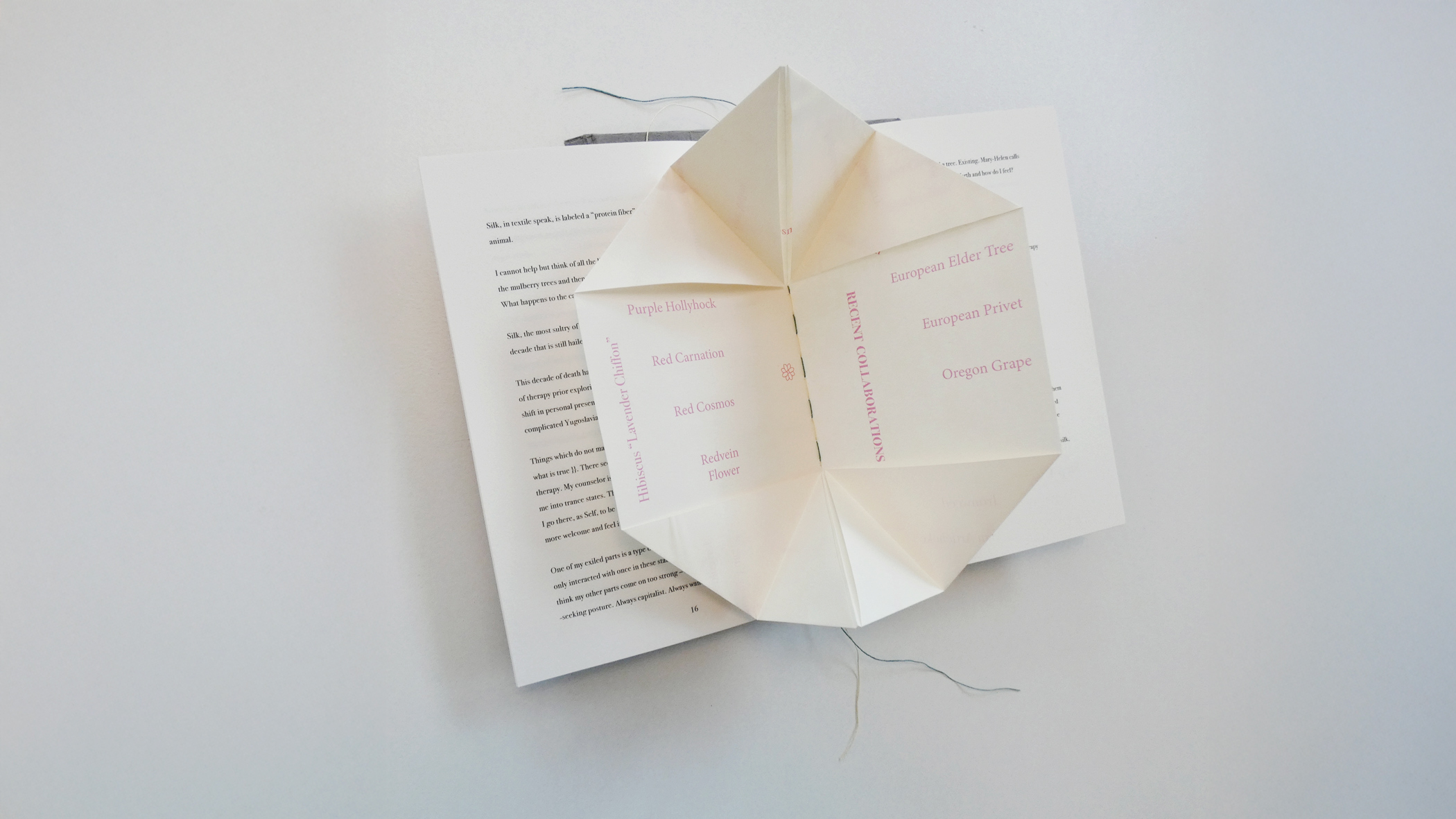 In the center is a yonic like fold containing in pink print including other co-collaborators for this project, all plants and flowers.